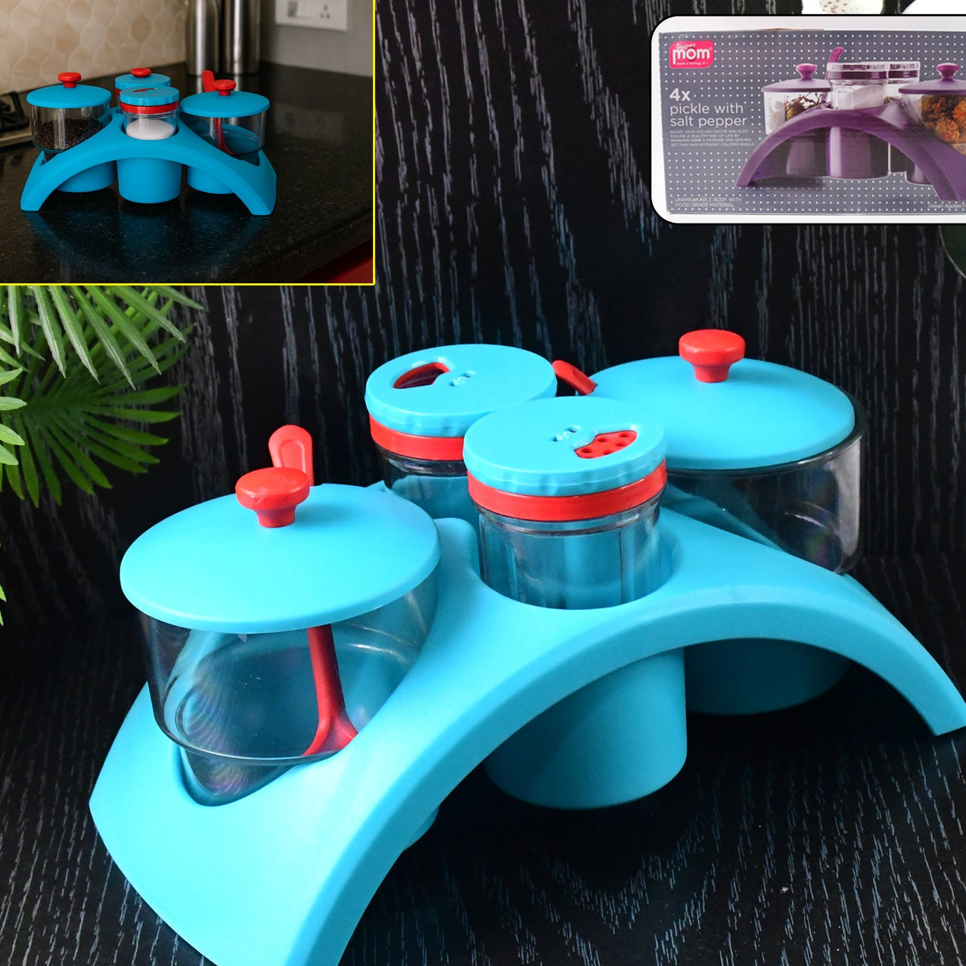 - 4 Pc Condiment Storage Set with Stand - Airtight Pickle, Salt & Pepper Containers