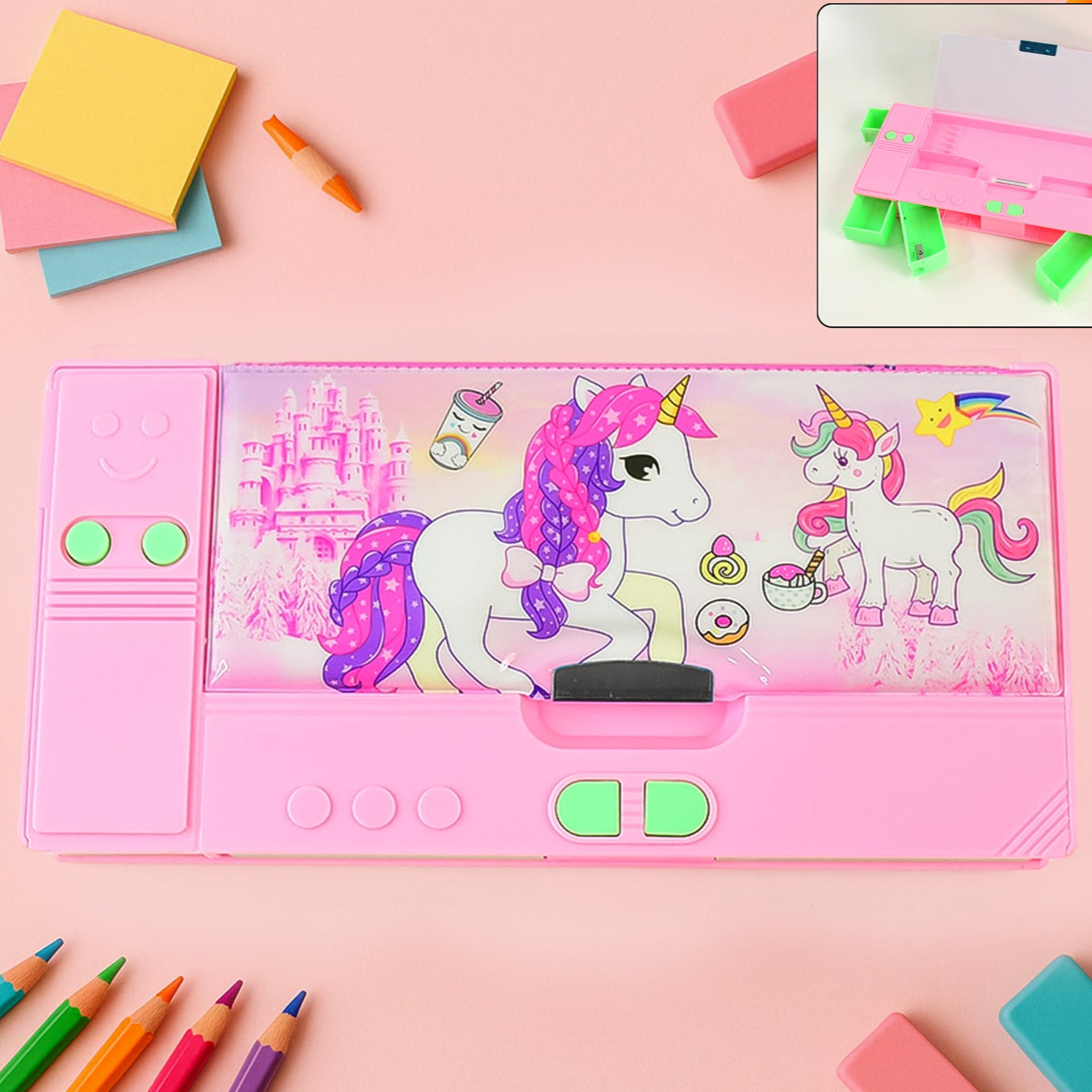 This large stationery organiser is designed to hold all your essential school supplies. It features a built-in calculator and a compass, making it a comprehensive tool for students. Keep your pencils, pens, and geometry tools neatly arranged in one place.
