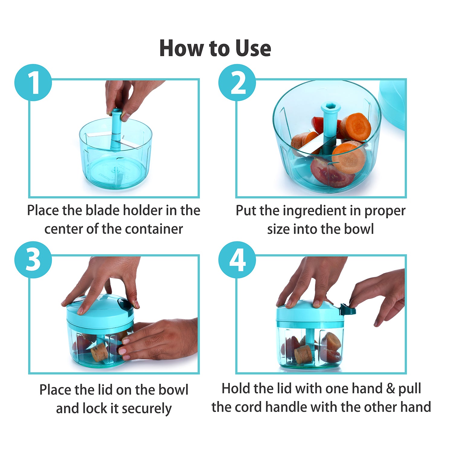 The sharp steel blades efficiently chop ingredients into fine pieces with just a few pulls. This manual food processor offers a convenient alternative to electric choppers, making meal preparation faster and easier.