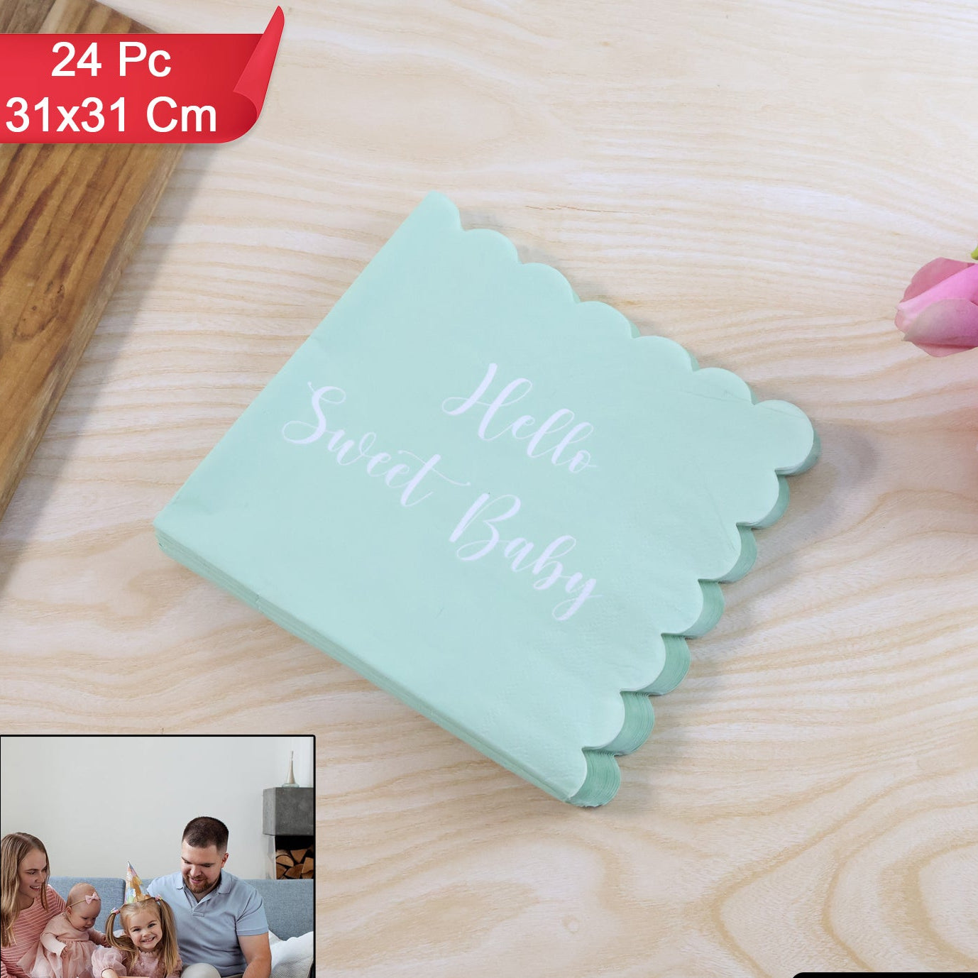 Hello Sweet Baby Party Paper Napkins – 24 Pc Disposable Table Napkins with Scalloped Edges – Soft, Absorbent Mint Green Tissue for Baby Shower, Birthday Party, and Celebration Décor (31 x 31 cm)