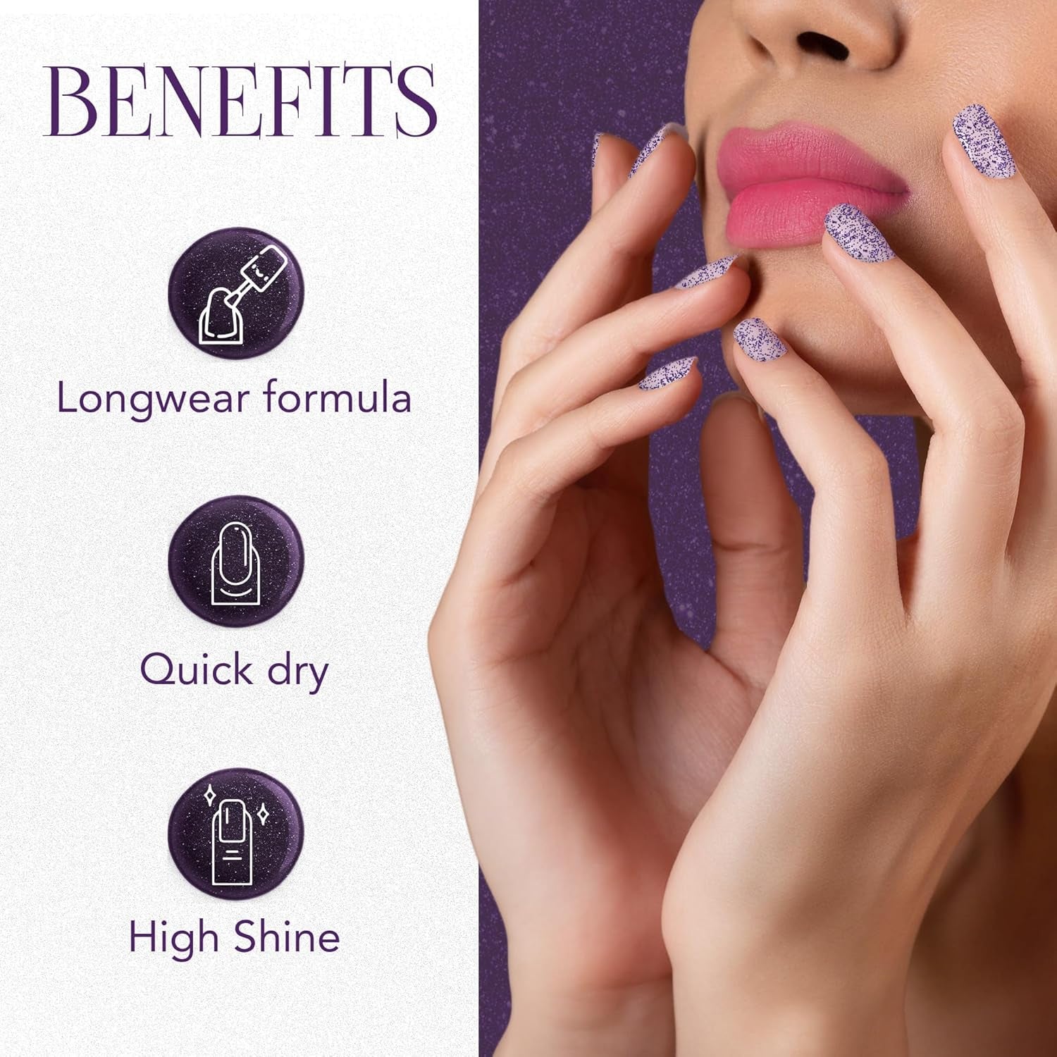 Add a touch of glamour to your nails with this sparkling purple glitter nail paint. Its dazzling effect is perfect for creating eye-catching manicures for parties and festive occasions. Elevate your look with a vibrant, shimmering finish that stands out.